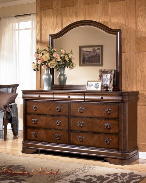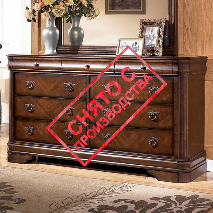 Низкий широкий камод с выдвижными шухлядками. Камод разделён на 6 широкие шухлядки и три маленькие для разных мелочей. Нижняя часть оформлена декоративным карнизом с массивными ножками.