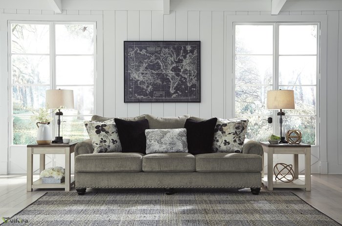 Диван тримісний Sembler 23402-38 від Будинку американських меблів Ashley поєднує в собі класичний й сучасний комфорт. М'яка оббивка брукового кольору приємна на дотик і легка у у догляді. Зручно вигнуті підлокітники, перевернені ніжки булочки, виконані в обробці штучного дерева, і декорування нікелевими цвяхами завершують образ.