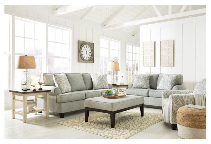 Комплект мягкой мебели KILARNEY 30201-38-35-21-08 от Дома американской мебели Ashley в загадочном нежно-бирюзовом тоне привнесет в ваш дом непринужденную атмосферу побережья. Изделия обтянуты красивой износостойкой и практичной мультитекстурной тканью. Каркас прочный и надежный, деревянные ножки конической формы максимально устойчивы.