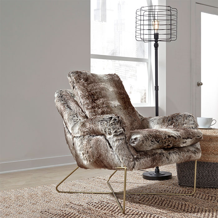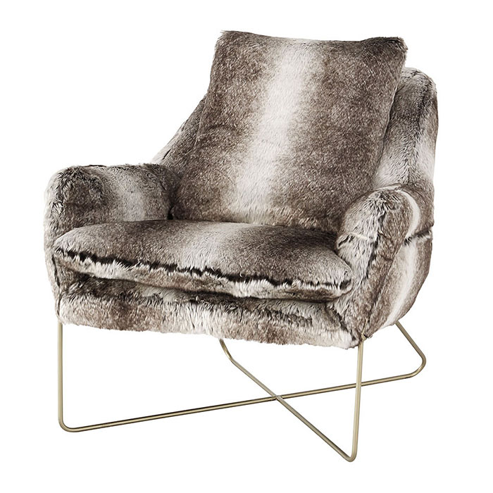 Кресло A3000052 выполненное из искусственного меха создаст гламурный вид в вашем доме благодаря полностью обитому корпусу искусственным мехом и позолоченным металлическим ножкам форме X. Различные оттенки серого придают акцентному креслу дополнительное тепло.